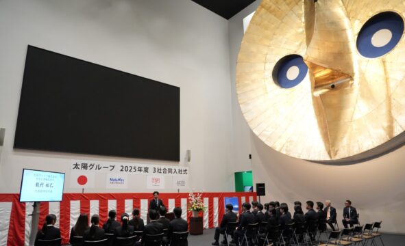 大型膜面構造物(テント構造物)や土木・物流資材などを手がける太陽工業株式会社(東京本社:東京都世田谷区、大阪本社:大阪市淀川区、社長:能村 祐己、以下:太陽工業)とイベントコンサルティングのTSP太陽株式会社(本社:東京都目黒区、社長:池澤 嘉悟、以下:TSP太陽)、イベントや施設の運営を手掛けるアクティオ株式会社(本社:東京都目黒区、社長:淡野 文孝、以下:アクティオ)の太陽グループ3社は共同で、「2025年度太陽グループ合同入社式」を、万博記念公園EXPO’70パビリオン別館展示室にて開催しました。太陽工業17名、TSP太陽5名、アクティオ2名の合計24名の新入社員を新たに迎え、3社社長より新入社員への祝辞を述べました。